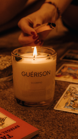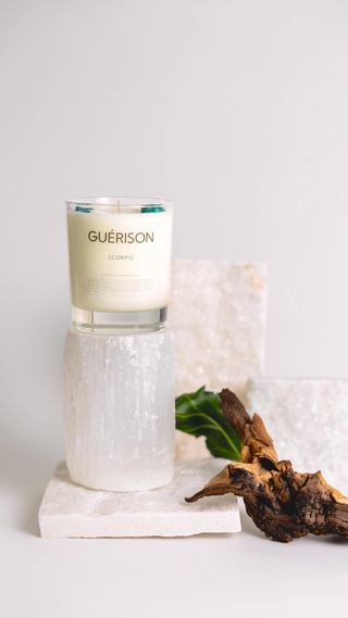 Each Guérison candle contains carefully chosen high-quality gemstones, creating an atmosphere that encourages healing and inspiration.