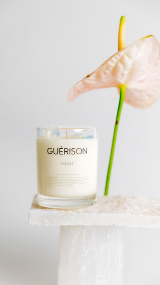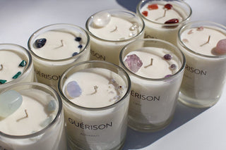 Guérison candles are developed, mixed, and hand-poured with all-natural soy vegan wax, fragrance oils, and hand-picked crystals.