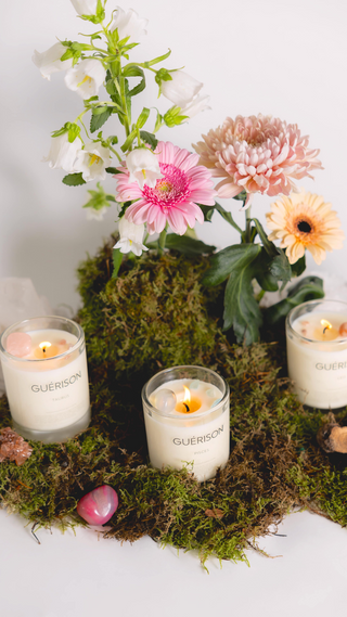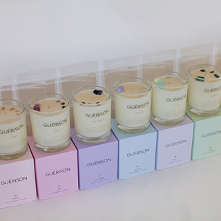 Guérison candles are developed, mixed, and hand-poured with all-natural soy vegan wax, fragrance oils, and hand-picked crystals.